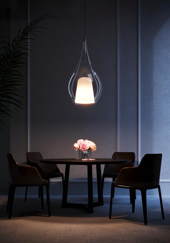 ZOE MAX lamp is a large blown glass hanging lamp. The gently shaped lines and wide selection of finishes and colors make it perfect for completing public and private interiors. The large dimensions seem perfect for multiple and always changing installations. With a diameter of 45 cm and a height of 80 cm it is one of the largest lamps made by Cangini and Tucci. The precious metallic finish creates a sophisticated atmosphere by releasing gradations of light that soften the illumination in the space.