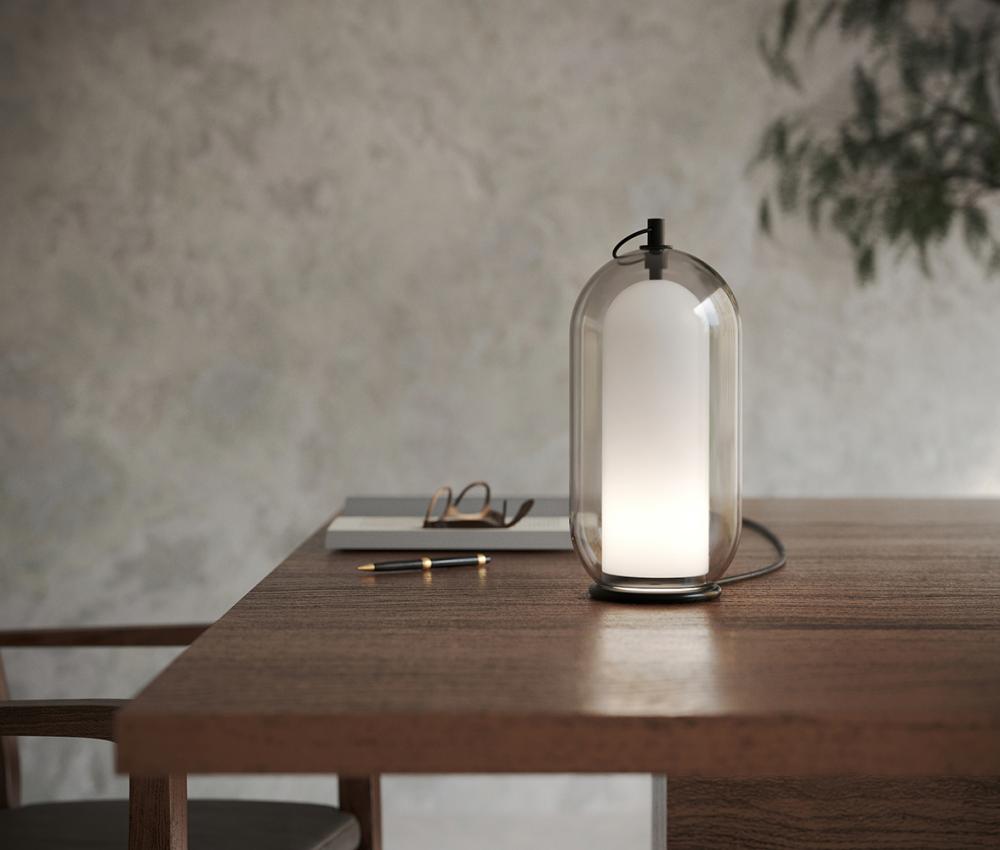 AERON lamp fits into living spaces, domestic and commercial, with a minimalist aesthetic capable of expressing beauty, uniqueness, and functionality. The body is made entirely of hand-blown glass, with an extremely slim silhouette and high-quality materials. AERON has a body, made entirely of hand-blown glass, which is characterized by a double chamber glass. The inner chamber is satin-finished to diffuse the light in a more harmonious and natural way and to reduce glare, while the outer surface is transparent and can be made in different colors. The metal frames are available in chrome, satin gold, and satin black nickel. The pendant lamp is realized in four dimensional variants. The table version, on the other hand, is made in three different sizes and on the top we find a handy metal ring, which serves to carry the lamp, almost like a lantern. The light is diffused very evenly along the generous inner surface of the lamp and this guarantees a very high quality of light. The clean lines allow for great versatility of installation, both for domestic environments and in hotels, restaurants, and retail.