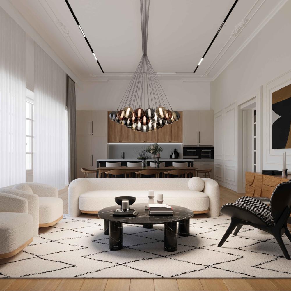 The handcrafted spheres of the Eclisse collection are available in a variety of color finishes, from traditional to metallized, and the metal frame is manufactured in a chrome finish.