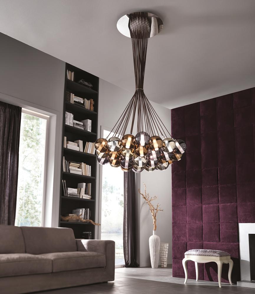 The handcrafted spheres of the Eclisse collection are available in a variety of color finishes, from traditional to metallized, and the metal frame is manufactured in a chrome finish.