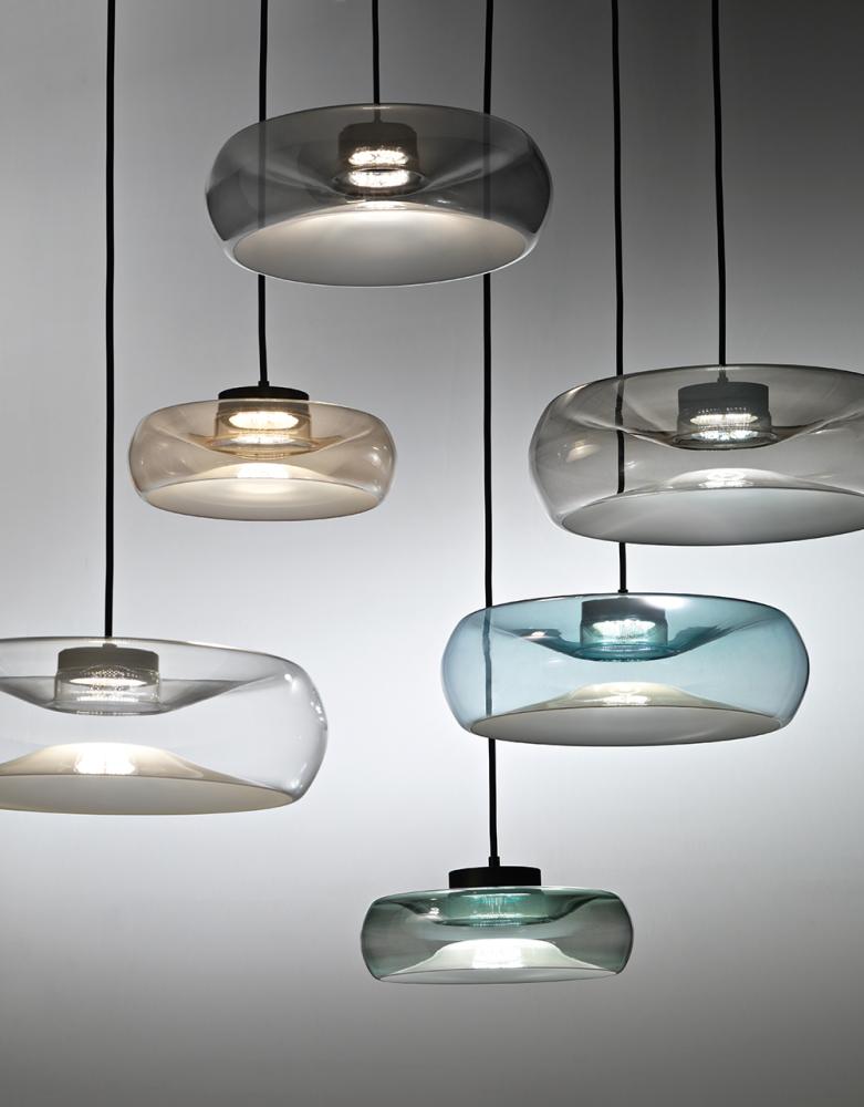 The FOLD lamp, designed by Cristian Li Voi, is available as a pendant lamp, wall lamp and floor lamp. The blown glass body of the FOLD lamp has a central fold that appears very light but contains within it a design complexity with a strong aesthetic value. In the FOLD lamp, the technical soul of the lighting body becomes an aesthetic element. The concentric metal cylinder, whose function is to dissipate the heat of the LED, integrates perfectly with the blown glass silhouette.
