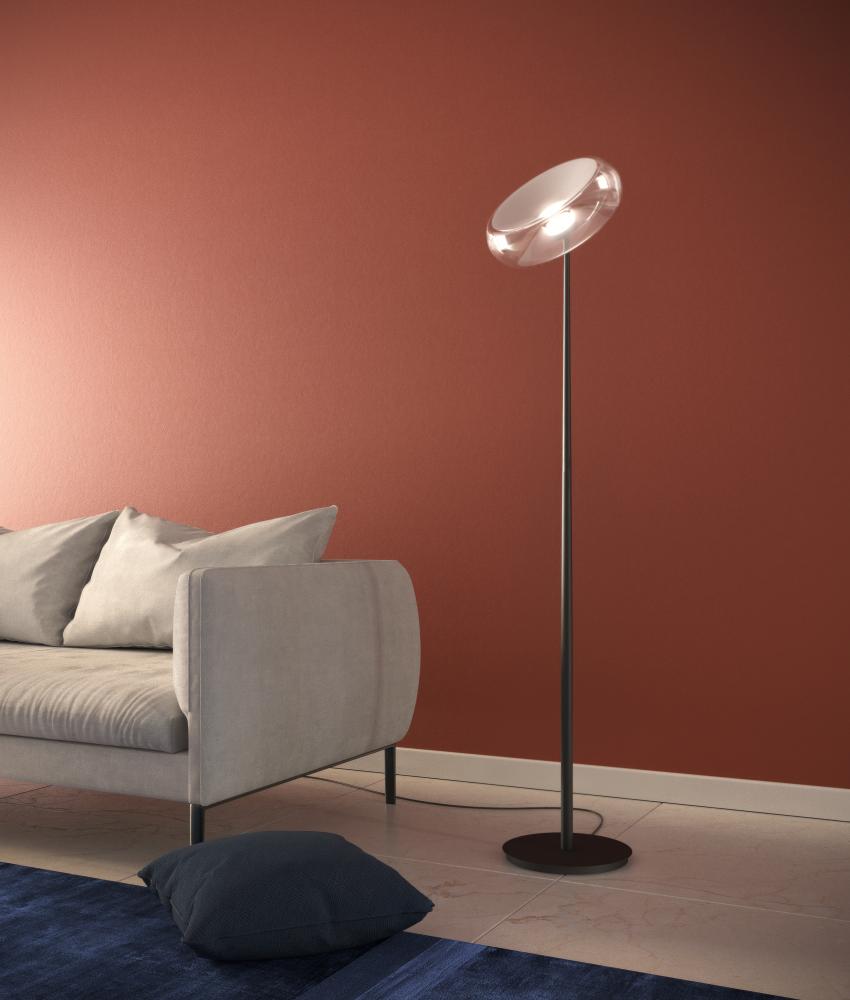 The FOLD lamp, designed by Cristian Li Voi, is available as a pendant lamp, wall lamp and floor lamp. The blown glass body of the FOLD lamp has a central fold that appears very light but contains within it a design complexity with a strong aesthetic value. In the FOLD lamp, the technical soul of the lighting body becomes an aesthetic element. The concentric metal cylinder, whose function is to dissipate the heat of the LED, integrates perfectly with the blown glass silhouette.