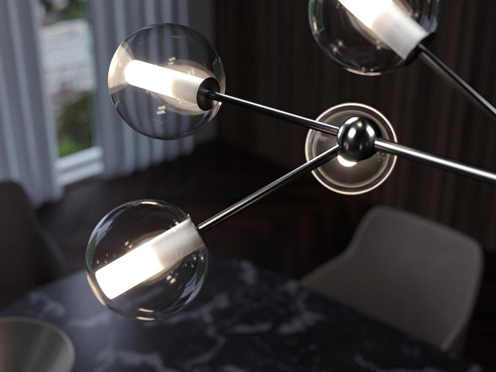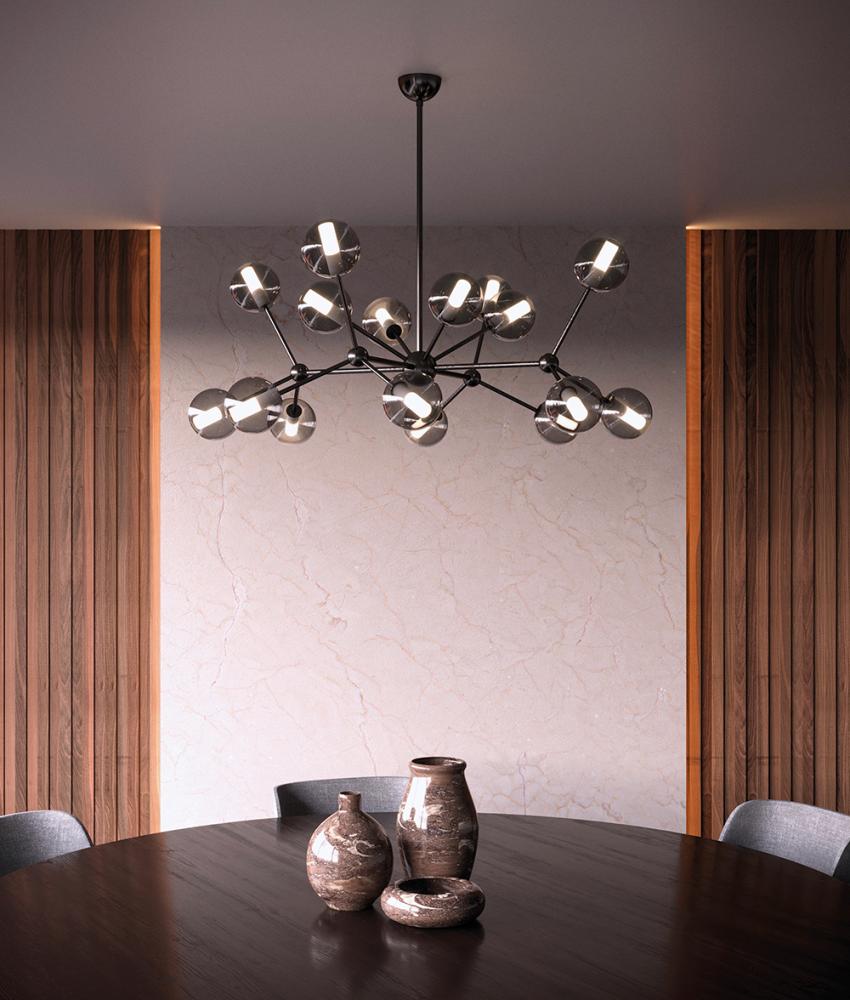 MIREA goes inside domestic interiors bringing the warmth of light. The collection is characterized by a style that evokes an elegance of the past, a refined balance of shapes and materials that match interiors with a refined, contemporary taste. The MIREA collection comprises five different variants: the chandelier, the pendant, the table lamp, the wall lamp, and the ceiling lamp. The spheres of the MIREA collection are entirely handmade by the expert hands of our master glassblowers and can be declined in different color finishes.