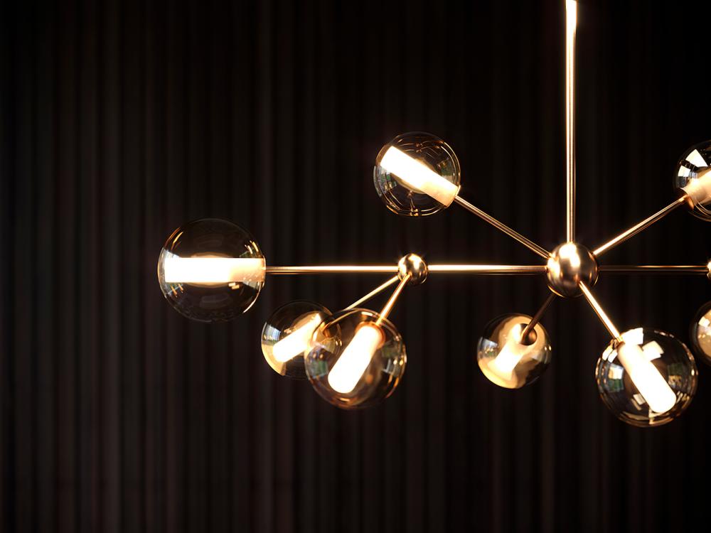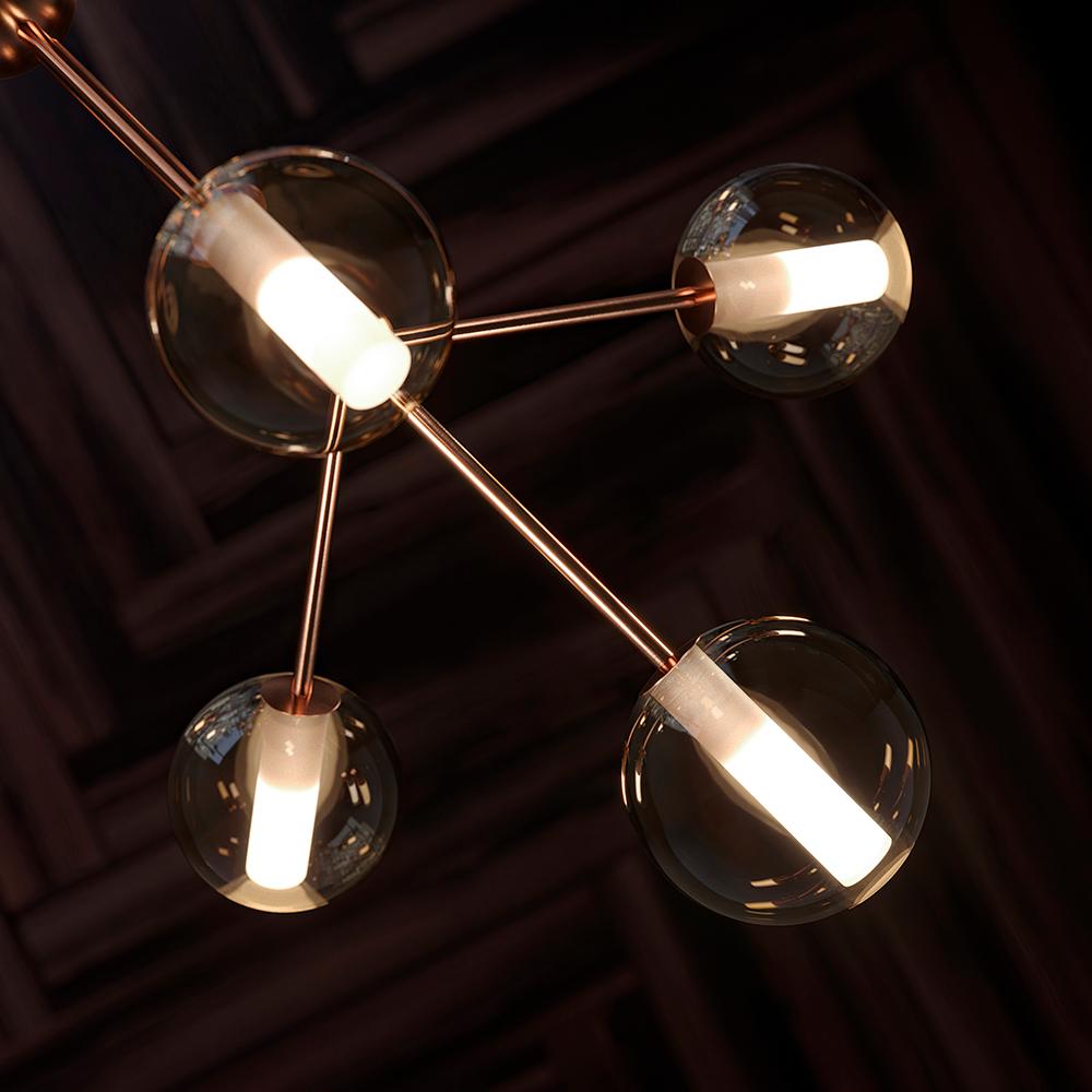MIREA goes inside domestic interiors bringing the warmth of light. The collection is characterized by a style that evokes an elegance of the past, a refined balance of shapes and materials that match interiors with a refined, contemporary taste. The MIREA collection comprises five different variants: the chandelier, the pendant, the table lamp, the wall lamp, and the ceiling lamp. The spheres of the MIREA collection are entirely handmade by the expert hands of our master glassblowers and can be declined in different color finishes.