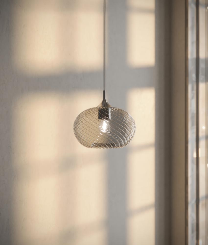 PARIGI is a collection of hanging, table, and wall lamps made of blown glass. These lamps are handmade and strongly inspired by the gestures and rotating movement during their creation. The blown glass surface with its ribbed geometric texture transforms the transparency of the glass into a play of reflections with light.