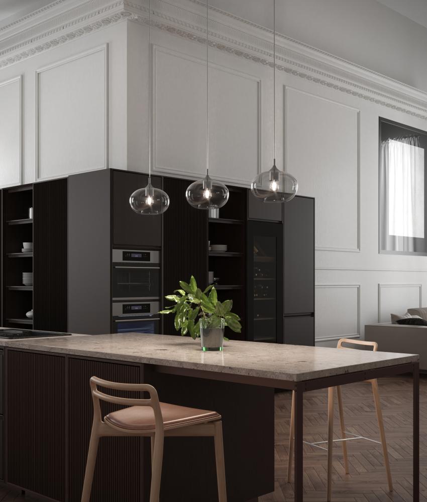 PARIGI is a collection of hanging, table, and wall lamps made of blown glass. These lamps are handmade and strongly inspired by the gestures and rotating movement during their creation. The blown glass surface with its ribbed geometric texture transforms the transparency of the glass into a play of reflections with light.