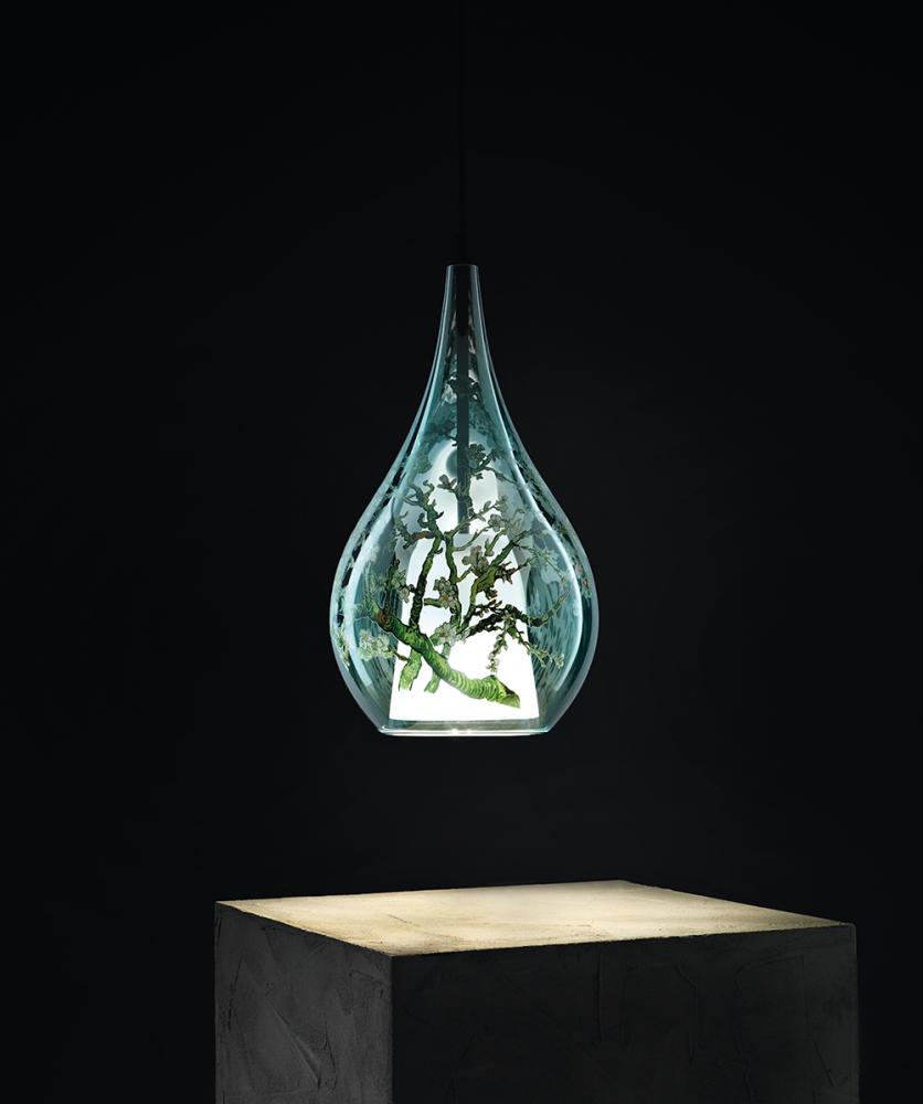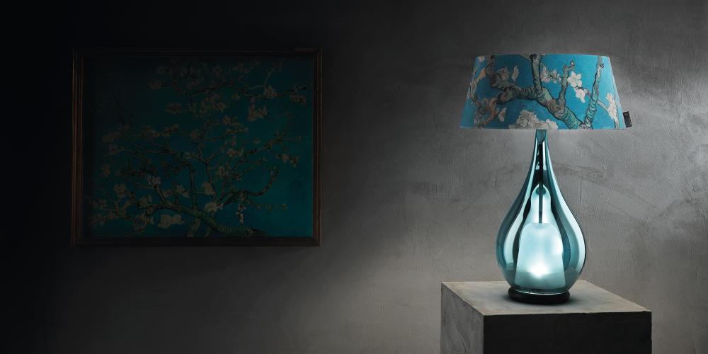 The art of the greatest impressionist painter of all time meets the quality of craftsmanship and Made in Italy. The painting ‘Almond blossom’ by Vincent Van Gogh is shaped on the blown glass body of the Zoe lamp. The artwork envelops the blown glass, transforming its silhouette into a beautiful play of transparencies. Unique details and craftsmanship are the protagonists of this collection in collaboration with the Van Gogh Museum in Amsterdam.