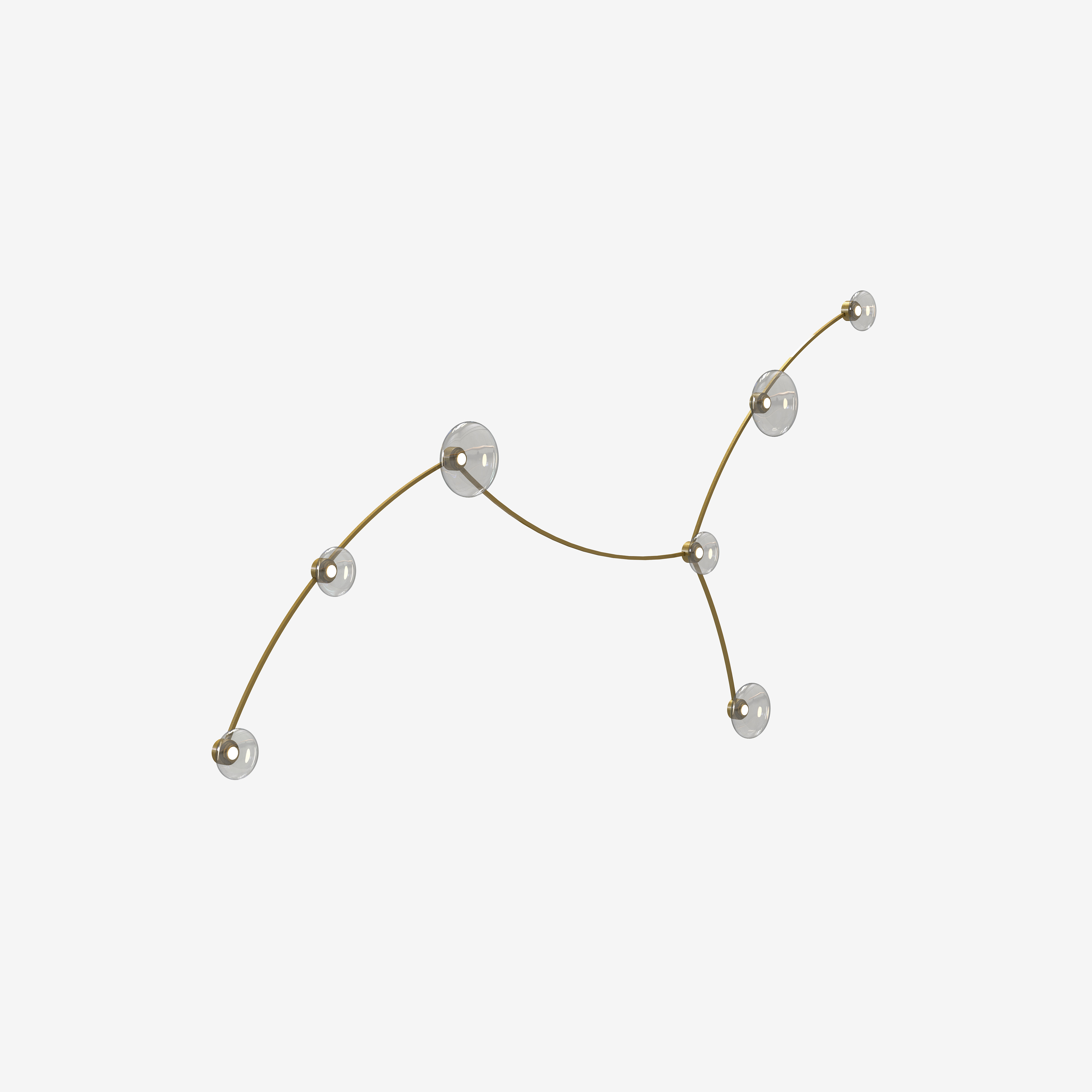 GREGH is a lighting system that brings the magic of the starry sky into our space. Its modular design evokes the complexity of constellations, offering coordinated wall, floor, and suspension solutions. Inspired by the starry mantle, this collection is made with noble and eternal materials: the thin metal structure traces orbits in space, while the glass, with its various shades, creates diffusers like small luminous planets. In this system, nodes of light float in a brilliant network that can expand vertically or horizontally, just like an astral diagram.